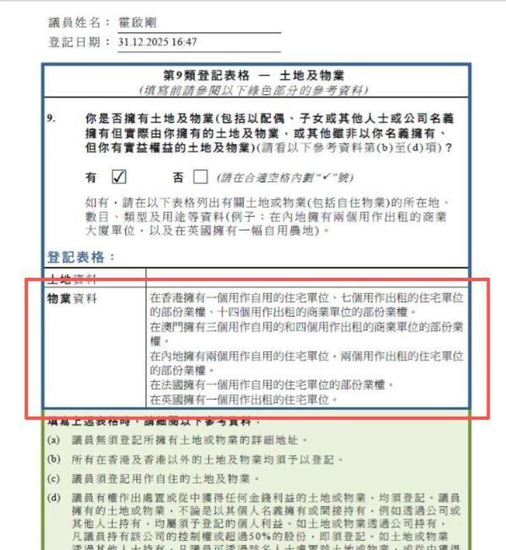 其实霍启刚干的事挺简单:按香港立法会的规定,把个人名下资产如实填表公开。35处物业,哪些自住、哪些出租、哪些和郭晶晶共有,写得明明白白。“部分业权”四个字被翻来覆去解读,殊不知这就是夫妻联名买房的常规写法,普通人这么写没人多看一眼,轮到他,倒成了“藏钱”的证据。 关键点在于,这套申报制度只涵盖个人直接持有的资产,不包括家族信托——这不是给他开的后门,而是所有议员都适用的规则。李嘉诚、李兆基早年就在这框架里运作,怎么到了他这儿,合规反倒成了可疑?